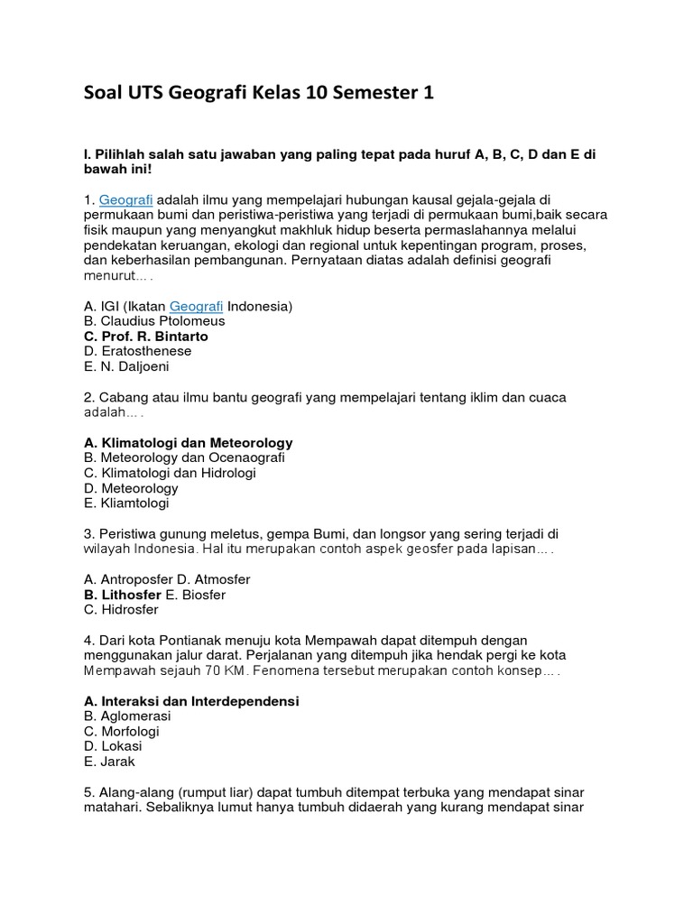 Geografi, sebagai ilmu yang mempelajari interaksi antara manusia dengan lingkungannya, senantiasa menawarkan wawasan yang mendalam tentang kompleksitas planet Bumi. Bagi siswa Kelas 10, semester 2 adalah momen krusial untuk mendalami fenomena-fenomena fisik bumi, mulai dari dinamika internal Bumi hingga interaksi atmosfer dan hidrosfer yang membentuk cuaca dan iklim. Ujian Tengah Semester (UTS) menjadi tolok ukur sejauh mana pemahaman siswa terhadap materi-materi tersebut telah terbangun. Artikel ini akan membahas secara komprehensif materi-materi kunci, strategi belajar efektif, serta menyajikan contoh-contoh soal UTS Geografi Kelas 10 Semester 2 yang relevan dan mendalam, baik dalam format pilihan ganda maupun esai, lengkap dengan pembahasannya.